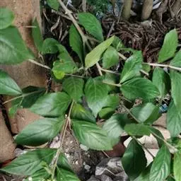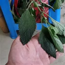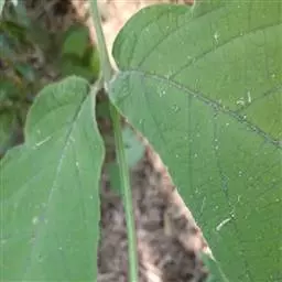 叶卵状披针形或菱伏披针形,有时卵形,长1.2-3.5厘米,宽0.5-1.8厘米,先端渐尖或急尖,基部渐狭,边缘具锐尖的疏齿,近基部全缘,纸质,上面榄绿色,无毛或近无毛,下面灰白色,无毛,散布凹陷腺点;叶柄长3-18毫米,腹凹背凸,腹面被微柔毛。