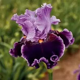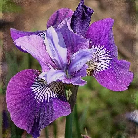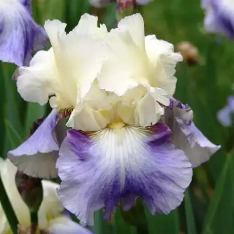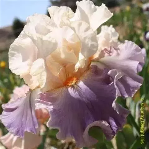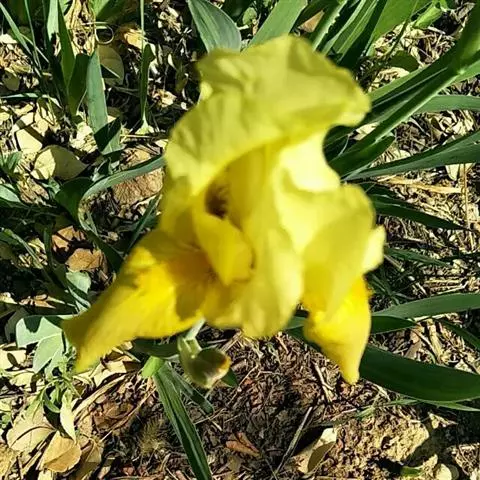 花茎实心,光滑,高40-60厘米,有不明显的纵棱,中、下部有2-3枚茎生叶;苞片3-5枚,膜质,披针形,长6-9厘米,宽1-1.5厘米,顶端渐尖或短渐尖,中脉明显,内包含有2-4朵花;花大,蓝紫色,直径9-10厘米;花梗长1.5-3.5厘米;花被管上部稍膨大,似喇叭形,长约2厘米,直径5-7毫米;外花被裂片倒卵形或椭圆形,长7.5-9厘米,宽4-4.5厘米,上部反折下垂,爪部楔形,中央下陷呈沟状,鲜黄色,无附属物,内花被裂片直立,倒披针形,长5-6.5厘米,宽4.8-1.5厘米;雄蕊长约3厘米,花药白色;花柱分枝扁平,花瓣状,拱形弯曲,长5-6厘米,宽约1.2厘米,顶端裂片半圆形,长1.5-2厘米,边缘有波状的牙齿,子房钝三角状圆柱形,上部略膨大,长2-2.2厘米,直径约6毫米。