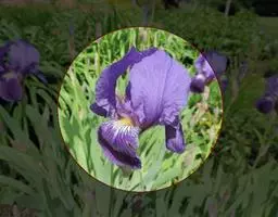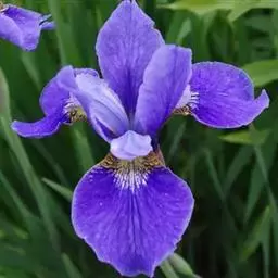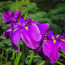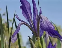 燕子花(学名:Iris laevigata Fisch. ex Fisch. & C. A. Mey.):多年生草本,植株基部围有棕褐色毛发状的老叶残留纤维。根状茎粗壮,斜伸,棕褐色;须根黄白色,有皱缩的横纹。叶灰绿色,剑形或宽条形。花茎实心,光滑,有2-3枚茎生叶;苞片3-5枚,内包含有2-4朵花;花大,蓝紫色,直径9-10厘米;外花被裂片倒卵形或椭圆形,上部反折下垂,爪部楔形,内花被裂片直立,倒披针形,长5-6.5厘米,宽4.8-1.5厘米。蒴果椭圆状柱形,有6条纵肋;种子扁平,半圆形,褐色,有光泽。花期5-6月,果期7-8月。
