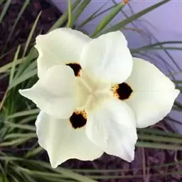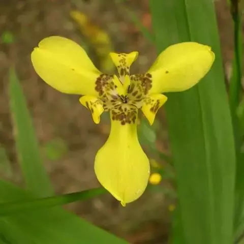 双色野鸢尾为多年生草本植物,叶子呈剑状淡绿色。…