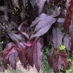 枝紫褐色,叶宽椭圆形至倒卵形,先端3裂状,缘有不等的粗重锯齿;花单瓣至重瓣,紫红色,1~2朵生于叶腋,花期4月;核果红色,近球形,有毛。