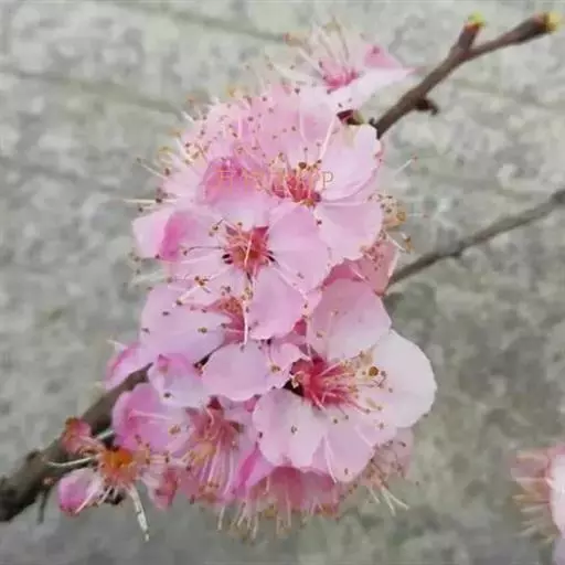 花1-2朵,先于叶开放,直径2-3厘米;花梗长4-8毫米;萼筒宽钟形,长3-5毫米,无毛或幼时微具毛;萼片卵形或卵状披针形,无毛,近先端疏生小锯齿;花瓣近圆形或宽倒卵形,长6-10毫米,先端圆钝,有时微凹,粉红色;雄蕊约25-30,短于花瓣;子房密被短柔毛,花柱稍长于雄蕊。