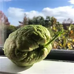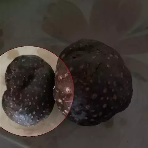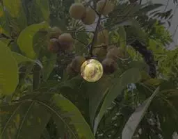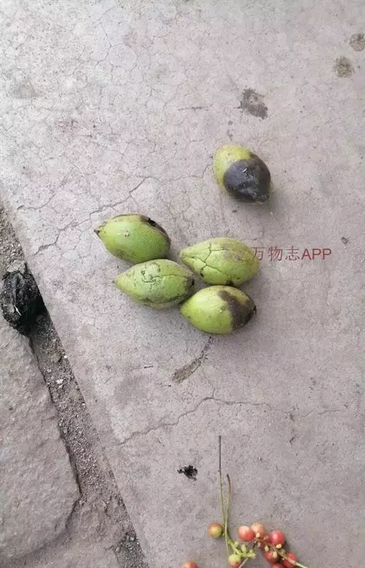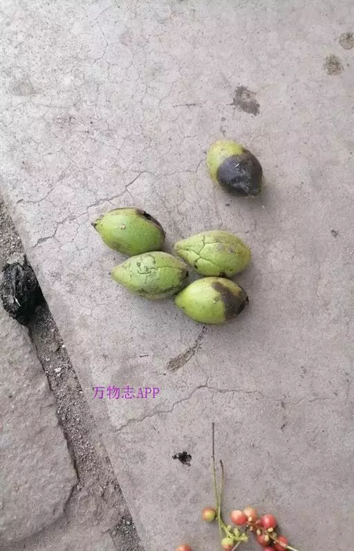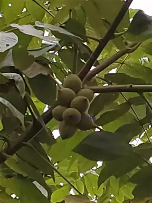 果序长约10-15厘米,俯垂,通常具5-7果实,序轴被短柔毛。果实球状、卵状或椭圆状,顶端尖,密被腺质短柔毛,长3.5-7.5厘米,径3-5厘米;果核长2.5-5厘米,表面具8条纵棱,其中两条较显著,各棱间具不规则皱曲及凹穴,顶端具尖头;内果皮壁内具多数不规则空隙,隔膜内亦具2空隙。花期5月,果期8-9月。