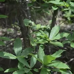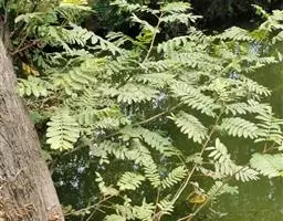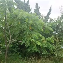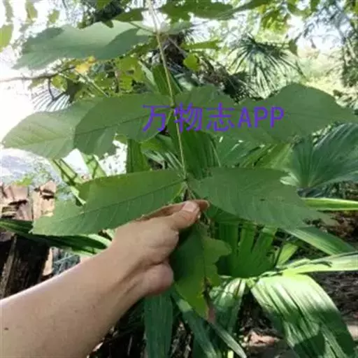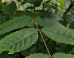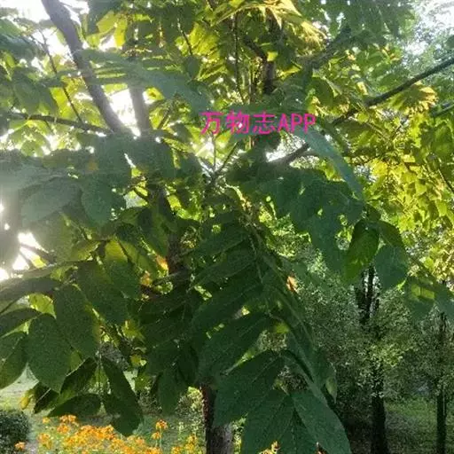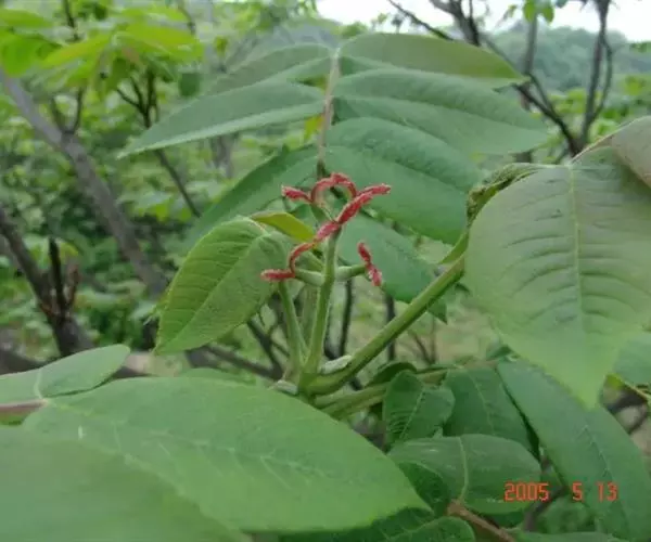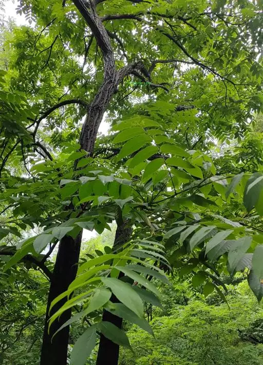 奇数羽状复叶生于萌发条上者长可达80厘米,叶柄长9-14厘米,小叶15-23枚,长6-17厘米,宽2-7厘米;生于孕性枝上者集生于枝端,长达40-50厘米,叶柄长5-9厘米,基部膨大,叶柄及叶轴被有短柔毛或星芒状毛;小叶9-17枚,椭圆形至长椭圆形或卵状椭圆形至长椭圆状披针形,边缘具细锯齿,上面初被有稀疏短柔毛,后来除中脉外其余无毛,深绿色,下面色淡,被贴伏的短柔毛及星芒状毛;侧生小叶对生,无柄,先端渐尖,基部歪斜,截形至近于心脏形;顶生小叶基部楔形。