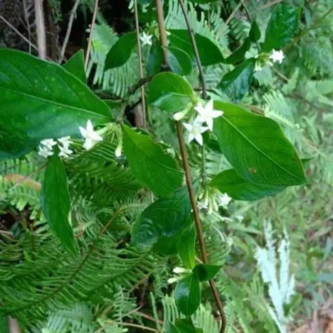 蔓性灌木,通常长达3米。小枝纤细,被有浓密而紧贴的绒毛。叶对生,近革质,披针形或长圆形,顶端长尖, 基部浑圆或钝圆,边全缘干后常向内卷,托叶线状锥尖,早落。花两性,离脚碟状,夏秋间开白花或淡黄色花,有小苞片。雄蕊着生在花喉冠部,花柱稍伸出冠管外,柱头纺锤状,被毛。初秋结果,果为蒴果,四裂状球形,成熟时裂为两果瓣,种子脱出。喜生在山边灌木丛中,深山沟谷。