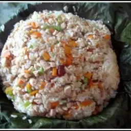 原料:三黄鸡 、荷叶、猪网油、肉丁、虾仁、香菇、笋片、面粉、料酒、酱油、糖、蚝油、盐、葱、姜、丁香粉、八角粉