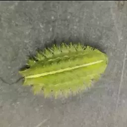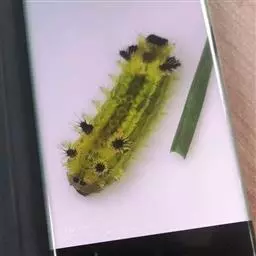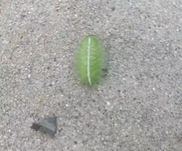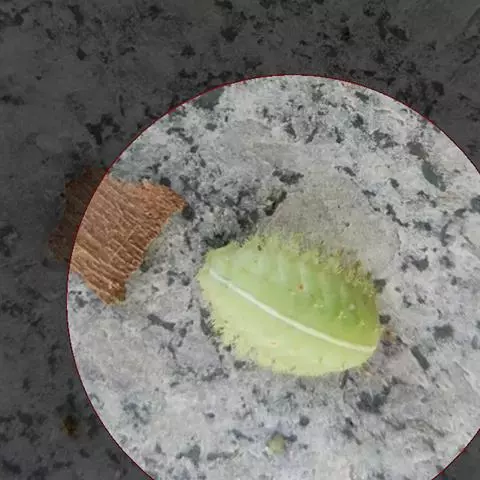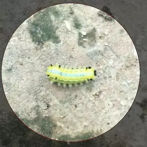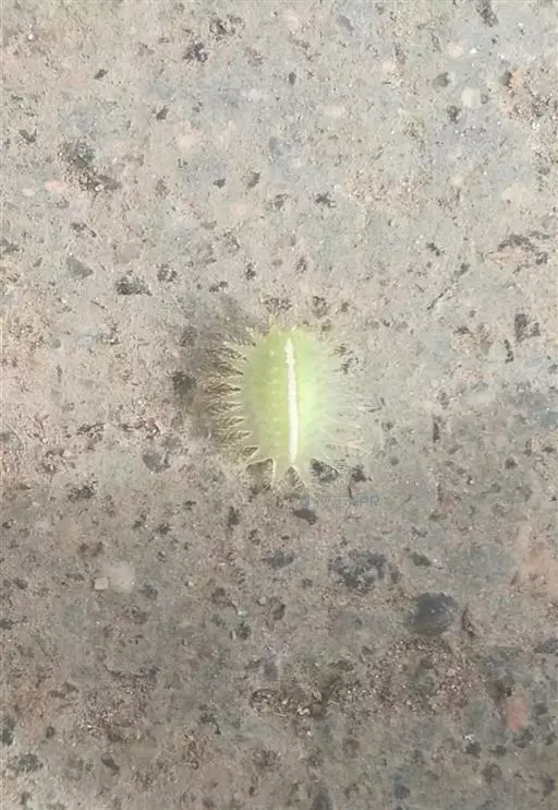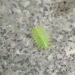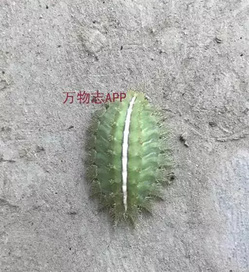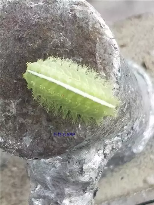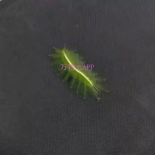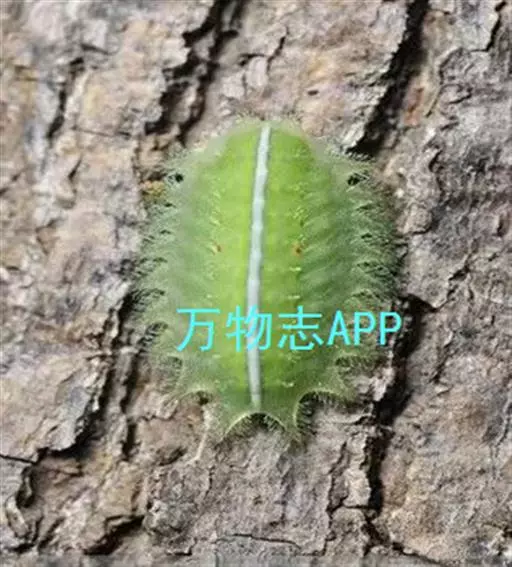 老熟幼虫体长21--26毫米,宽16毫米,体扁、椭圆形,背部稍隆起,形似龟背。全体绿色或黄绿色,背线白色。体两侧各有10个瘤状突起,其上生有刺毛,每一体节的背面有2小丛刺毛,第四节背面两侧各有一红点。