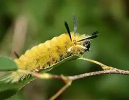 以幼虫蚕食植株叶片,低龄啃食叶肉,稍大食成缺刻和孔洞,严重时食成光秆,致树势衰弱。