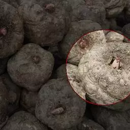 块根厚大,扁圆形,外皮粗糙,灰褐色,叶互生,具长柄,盾状着生,叶片近圆形,全缘,掌状脉7~9条,两面无毛,下面灰白色。花雌雄异株,暗红色,复伞花序腋生,花柄与叶柄近等长,核果圆形,熟时红色。主要