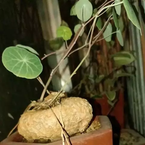 草质落叶藤本,全株无毛,有硕大的扁球状块根,暗灰褐色,嫩枝梢肉质,紫红色,有白霜。叶扁圆形,稀近圆形,长3-5厘米,宽5-6.5厘米,下面稍粉白,掌状脉3块以上。叶柄长4-6厘米,质状着生叶片基部约1-2厘米处。花序梗长1-4厘米,丛生几个至十几个小聚伞花序,每序2-3花,花小,紫色。核果红色,倒卵形,背部两侧有小横助16-20条。块根含多量瑟法丹质和轮黄藤宁,能清热解毒、镇静、理气止痛。 山乌龟