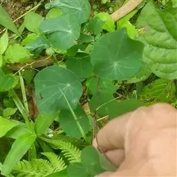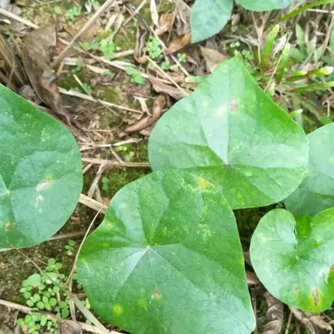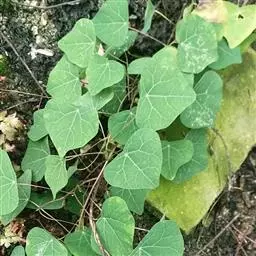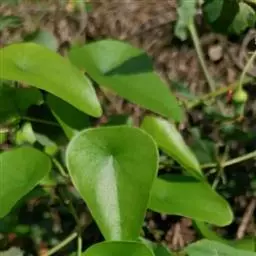 2、头花千金藤:S.cepharanthaHayataexyamamoto又称金钱吊乌龟,藤木,块根肥厚,长椭圆形,外皮暗褐色。茎基部木化,带紫色。叶互生、柄细长;叶片盾状着生,三角状圆形,长宽近等,全缘,上面深绿色,下面灰白色。花雌雄异株,头状聚伞花序腋生。核果球形,熟时紫红色,根入药,称白药子。