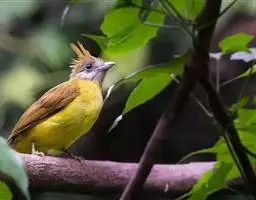 白喉冠鹎:体长20-25厘米。头顶红褐色,有长而细的羽冠、红褐色,头侧灰色。上体橄榄绿黄色,…
