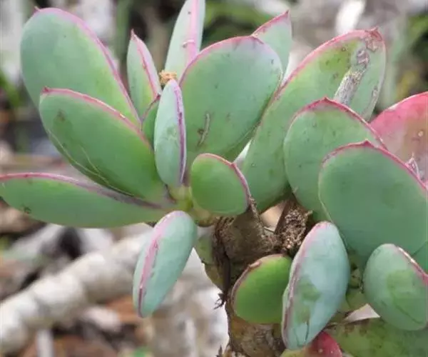 高50~80厘米,茎、枝均为绿色,有时略带紫晕,表面粗糙,残留有老叶脱落的鳞状物。肉质叶片倒卵形,青绿色,稍有白粉,叶缘及叶片基部均呈紫色,叶长4~6厘米,宽2~3厘米。头状花序高50~100厘米,小花群生,黄色或朱红色。