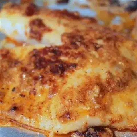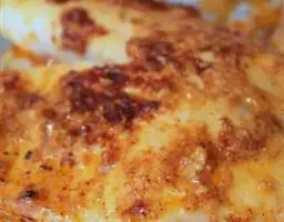 3. 鸡胸肉洗净,用胡椒盐、迷迭香稍微腌一下,入油锅煎至肉成金黄色即可取出,淋上少许做法2的酱汁,加少许披萨起司后,放入烤箱烤至起司溶化即可取出备用。
