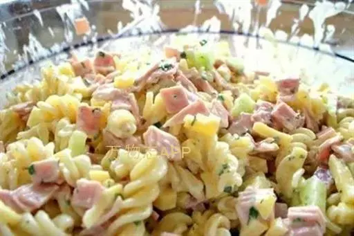 【原料】:意大利贝壳面、广式腊肠、胡萝卜、黄瓜、豆腐干、香菇、豌豆、玉米、香油、盐、鸡精。