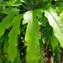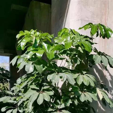 昆士兰伞木,吕松鹅掌柴 ,称昆石兰遮树,澳洲鸭脚木、方式叶鹅掌柴、伞树、大叶伞。叶片阔大,柔软下垂,形似伞状,株形优雅轻盈,易于管理,适于客厅的墙隅与沙发旁边置放,是室内理想的观叶植物。但目前多由南方引进,成本较高。常绿乔木,高可达30~40米。茎杆直立,少分枝,嫩枝绿色,后呈褐色,平滑。叶为掌状复叶,小叶数随树木的年龄而异,幼年时3~5片,长大时5~7片,至乔木状时可多达16片。小叶片椭圆形,先端钝,有短突尖,叶缘波状,革质,长20~30厘米,宽10厘米,浓绿色叶子。有光泽,叶背淡绿色。叶柄红褐色,长5~10厘米。浆果,圆球形,熟时紫红色。
