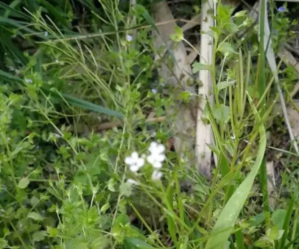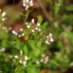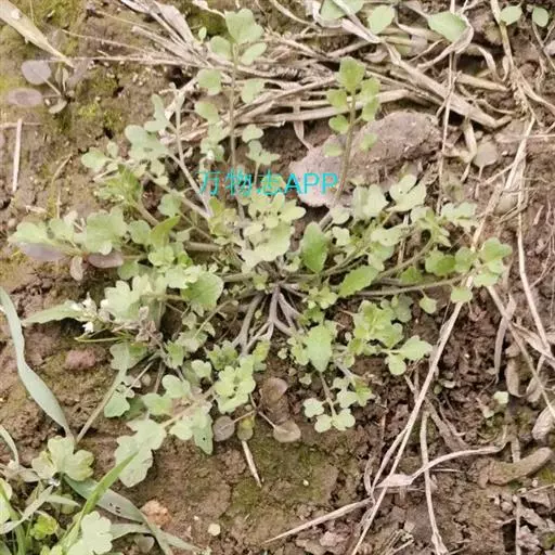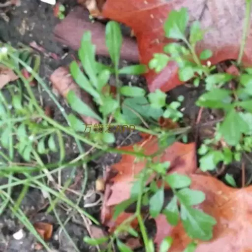 碎米荠(Cardamine hirsuta L. ):为罂粟目、十字花科、碎米荠属一年生小草本,高15-35厘米。茎直立或斜升,下部有时淡紫色,上部毛渐少。基生叶具叶柄,顶生小叶肾形或肾圆形;茎生叶具短柄;全部小叶两面稍有毛。总状花序生于枝顶,花小,花梗纤细;萼片绿色或淡紫色,长椭圆形,外面有疏毛;花瓣白色,倒卵形。长角果线形,稍扁,无毛;果梗纤细,直立开展。种子椭圆形,顶端有的具明显的翅。花期2-4月,果期4-6月。