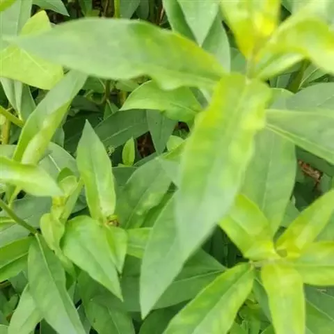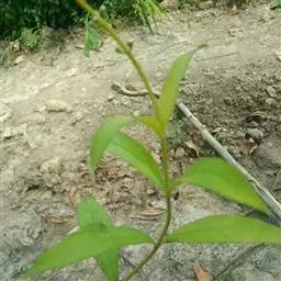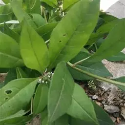 叶对生,卵状披针形,长4-10厘米,宽1.2-3.2厘米,先端长渐尖或近尾状,基部圆形,无柄或近于无柄,上面绿色,下面粉绿色,两面均有暗紫色或黑色腺点及短腺条,沿边缘尤密,中肋在上面稍隆起,侧脉纤细,4-5对,网脉不明显。