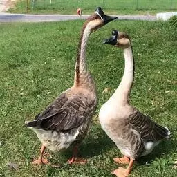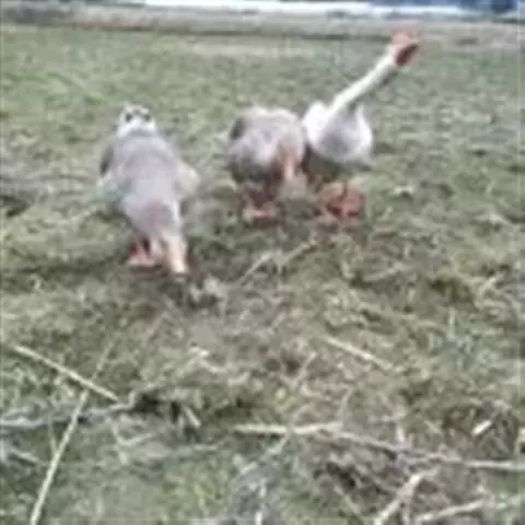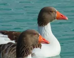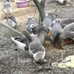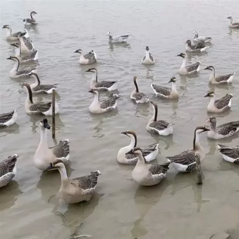 狮头鹅 羽毛灰褐色或银灰色,腹部羽毛白色。头大而眼小,头部顶端和两侧具有较大黑肉瘤,鹅的肉瘤可随年龄而增大,形似狮头,故称狮头鹅。颔下肉垂较大。嘴短而宽,颈长短适中,胸腹宽深,脚和蹼为橙黄色或黄灰色,成年公鹅体重10-12公斤,母鹅9-10公斤。生长迅速,体质强健。成熟早,肌肉丰厚,肉质优良。但年产卵量少,仅有25-35个,每个卵重平均约有203克左右。极耐粗饲,食量大。75-90日龄的肉用鹅,体重为5-7.5公斤。行动迟钝,觅食能力较差。有就巢性,现已向全国各地推广。