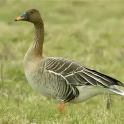 豆雁,雁形目鸭科。成鸟头、颈、背灰褐色,带淡黄色羽缘;尾上覆羽白色,尾羽黑褐色带白端,…