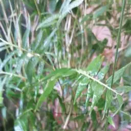 凤尾竹 Raeusch. ex Schult. ’Fernleaf’ R. A. Young)是禾本科,簕竹属孝顺竹的变种。植株较高大,杆高可达6米,竿中空,小枝稍下弯,下部挺直,绿色;竿壁稍薄;节处稍隆起,无毛;叶鞘无毛,纵肋稍隆起,背部具脊;叶耳肾形,边缘具波曲状细长繸毛;叶舌圆拱形,叶片线形,上表面无毛,下表面粉绿而密被短柔毛,小穗含小花,中间小花为两性;外稃两侧稍不对称,长圆状披针形,先端急尖;内稃线形,脊上被短纤毛,花药紫色,子房卵球形,羽毛状。成熟颖果未见。原产中国,华东、华南、西南以至台湾、香港均有栽培。凤尾竹喜温暖、湿润和阳光充足的环境,耐寒。宜土层深厚、肥沃、疏松的微酸性壤土。该种观赏价值较高,宜作庭院丛栽,也可作盆景植物。全草或根入药,味淡、微苦,性寒,有清热利湿、凉血止血、消肿解毒功效,可治痢疾、泄泻等多种病症。凤尾