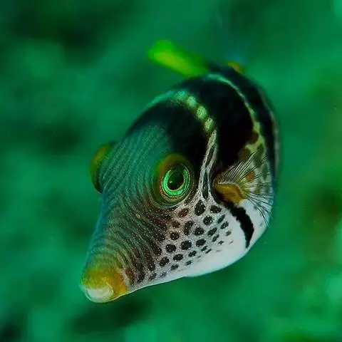 一心两用:河鲀的两只眼睛,一只用来追捕猎物的,同时另一只可以用来放哨。这一特点是很多动物(包括人类)无法比拟的。