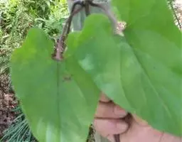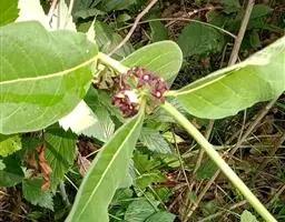 半灌木;茎上部缠绕,下部直立,全株被绒毛。叶对生,纸质,宽卵形或椭圆形,长7-10厘米,宽3-6厘米, 顶端锐尖,基部圆形或近心形,两面被黄色绒毛,边具绿毛;侧脉6-8对。伞形状聚伞花序腋生,近无总花梗,着花10余朵;花序梗被绒毛,长仅1毫米,稀达10毫米;花萼外面被柔毛,内面基部5枚腺体极小,裂片狭披针形,渐尖;花冠初呈黄白色,渐变为黑紫色,枯干时呈暗褐色,钟状辐形;副花冠极低,比合蕊冠为短,裂片三角形;花药近菱状四方形;花粉块每室1个,长圆形,下垂;柱头略为凸起,顶端不明显2裂。蓇葖单生,宽披针形,长5厘米,直径1厘米,向端部渐尖;种子宽卵形,暗褐色,长5毫米,宽3毫米;种毛白色绢质,长2厘米。花期5-8月,果期7-9月。