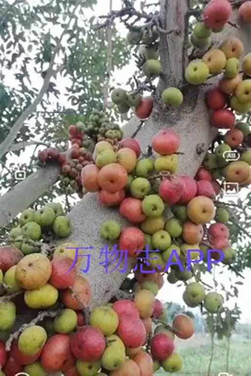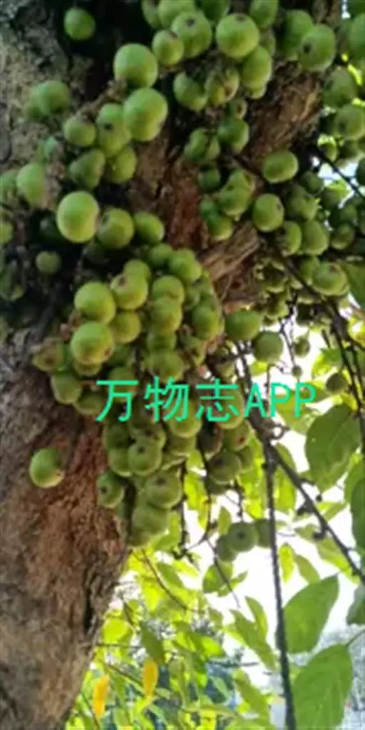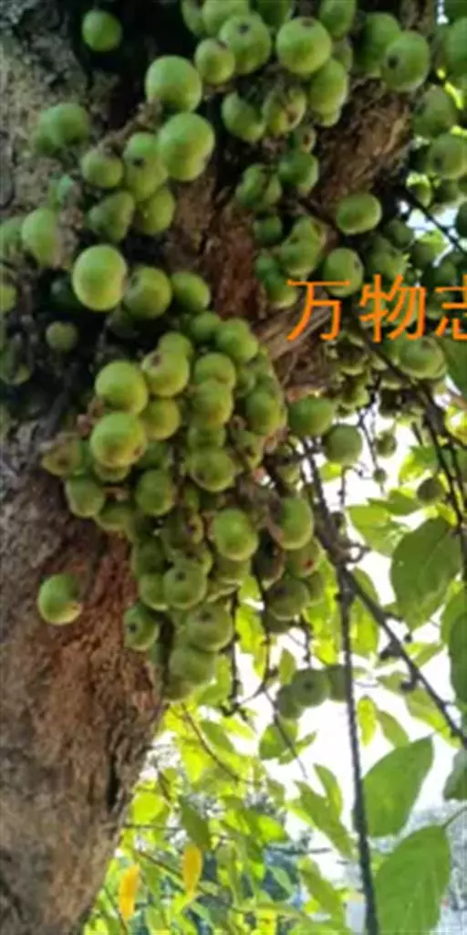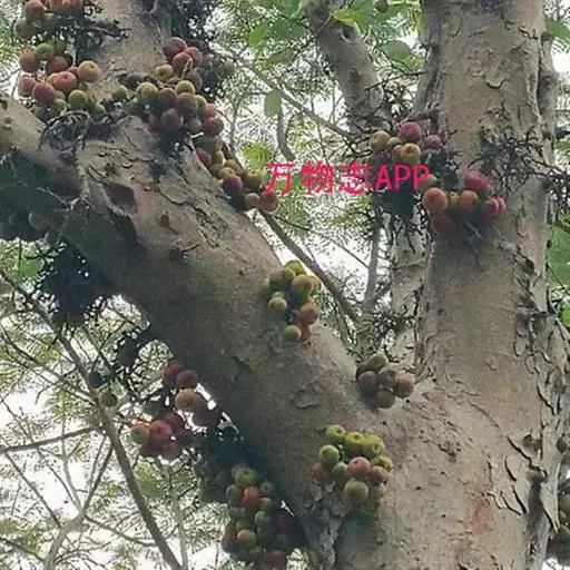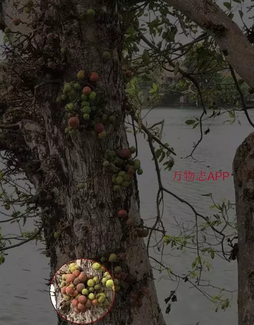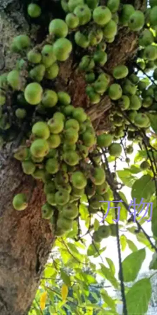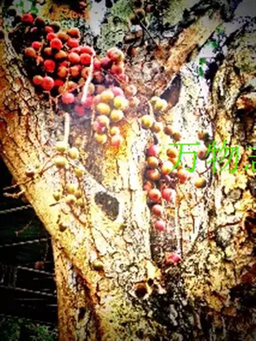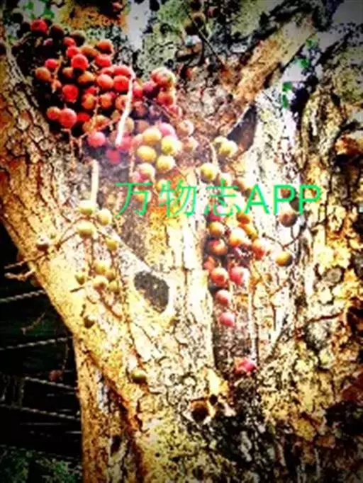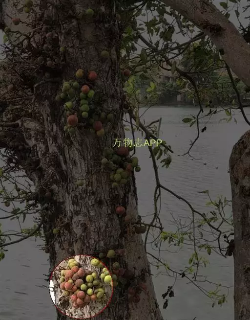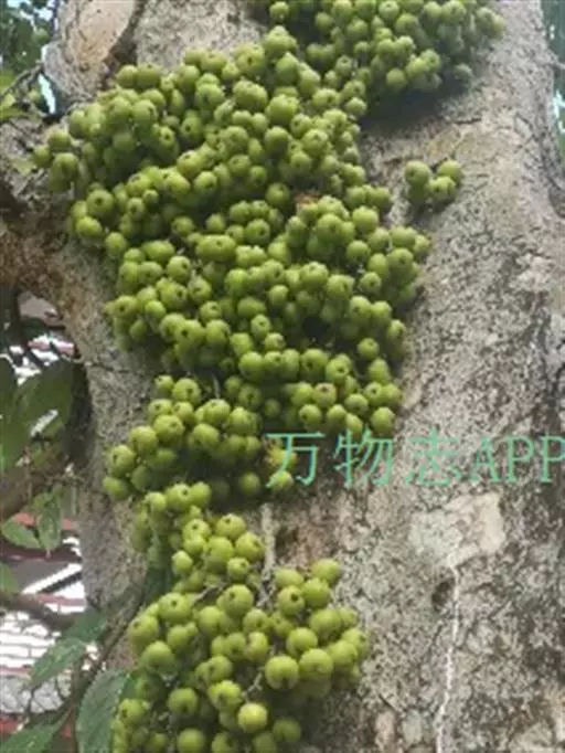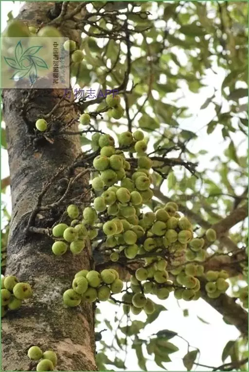 榕果聚生于老茎瘤状短枝上,稀成对生于落叶枝叶腋,梨形,直径2-2.5厘米,顶部脐状,压平,基部缢缩成柄,基生苞片3,三角状卵形,总梗长约1厘米;雄花生于榕果内壁近口部,无柄,花被片3-4,雄蕊2;瘿花和雌花有柄,花被线形,先端有3-4齿,花柱侧生,柱头棒状。成熟榕果橙红色。花期5-7月。