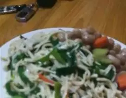 方便面不加料用水煮熟,放入凉水中冲凉后捞起,加入蒜泥、麻酱、醋、胡萝卜、咸菜、黄瓜丝,凉拌。