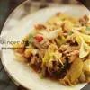 3.锅上火,油烧热,将肉丝、火腿丝、尖椒丝、香菇丝放入炒熟,再加入泡好的面一起炒