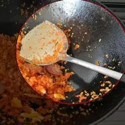 4.加入1杯米酒、1杯麻油和1杯酱油,与锅内食材一同搅拌均匀。