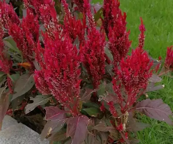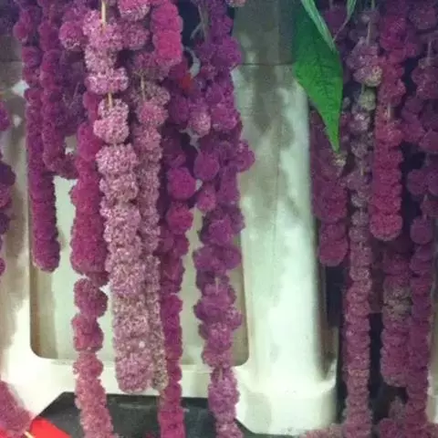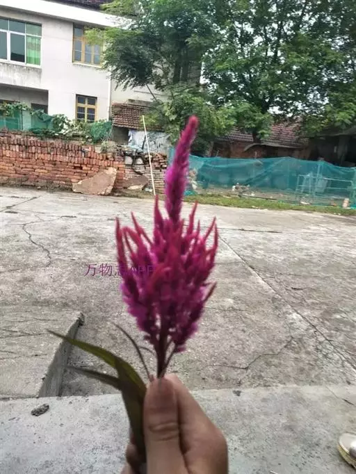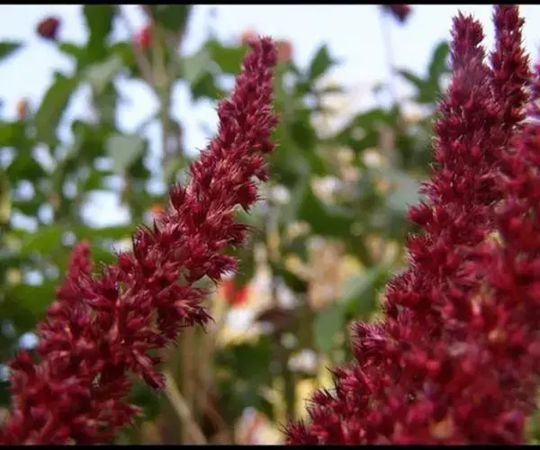 千穗谷(Amaranthus hypochondriacus L.)一年生草本;茎绿色或紫红色,分枝,无毛或上部微有柔毛。叶片菱状卵形或矩圆状披针形,具凸尖,基部楔形,无毛,上面常带紫色;叶柄无毛。圆锥花序顶生,直立,圆柱形,不分枝或分枝,由多数穗状花序形成,花簇在花序上排列极密;苞片绿色或紫红色,背部中脉隆起;花被片矩圆形,绿色或紫红色。胞果近菱状卵形,环状横裂,绿色,上部带紫色,超出宿存花被。种子近球形,白色,边缘锐。花期7-8月,果期8-9月。