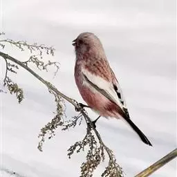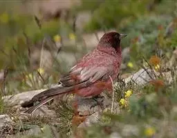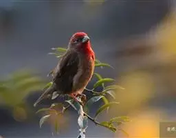红腰朱雀:体长12-14厘米,小型鸟类。雄鸟前额和眉纹玫瑰粉红色,头顶和一宽的贯眼带深红褐色,背红…