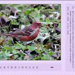 北朱雀,是燕雀科朱雀属鸟类。雄鸟额和头顶前部珠白色具窄的粉红色羽缘,…