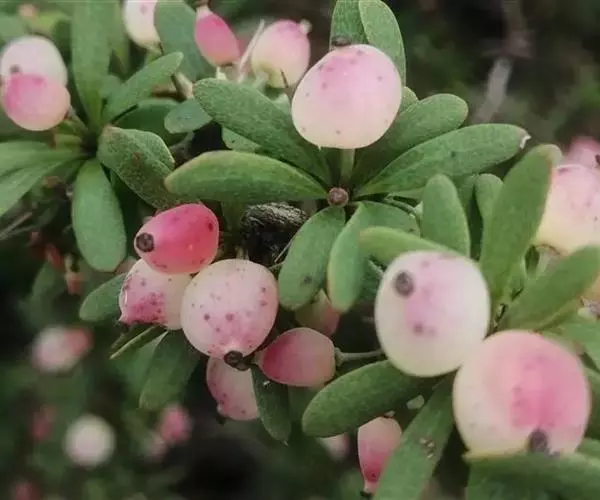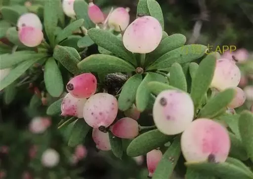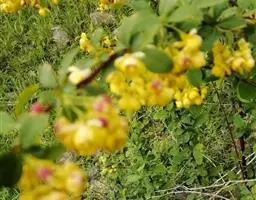 金花小檗(学名:Berberis wilsonii Hemsl.):枝常弓弯,老枝棕灰色,幼枝暗红色,具棱,散生黑色疣点;茎刺细弱,三分叉,淡黄色或淡紫红色。叶革质,倒卵形或倒卵状匙形或倒披针形,先端圆钝或近急尖,有时短尖,基部楔形,上面暗灰绿色,网脉明显,背面灰色,常微被白粉,网脉隆起;近无柄。花簇生;花梗棕褐色;花金黄色;小苞片卵形;萼片2轮,外萼片卵形,内轮萼片倒卵状圆形或倒卵形;花瓣倒卵形,先端缺裂,裂片近急尖;雄蕊长约3毫米,药隔先端钝尖。浆果近球形,粉红色,顶端具明显宿存花柱,微被白粉。花期6-9月,果期翌年1-2月。