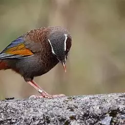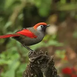 赤尾噪鹛中型鸟类,体长24~28厘米。头顶至后颈红棕色,两翅和尾鲜红色,眼先、眉纹、颊、颏和喉黑色,…