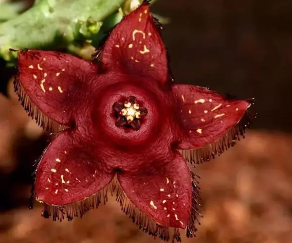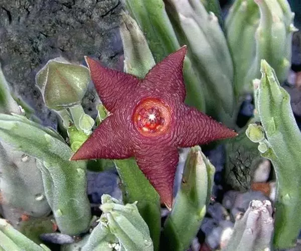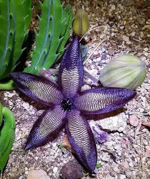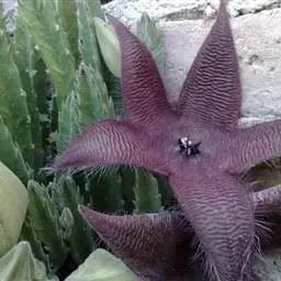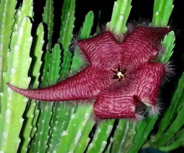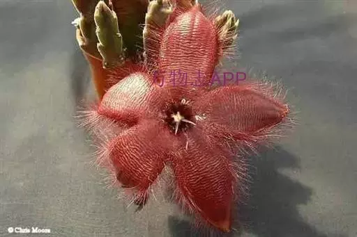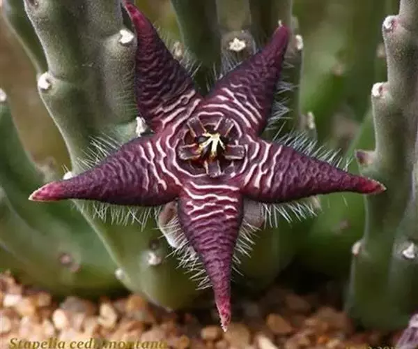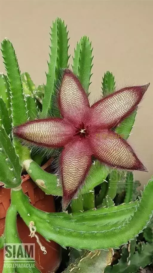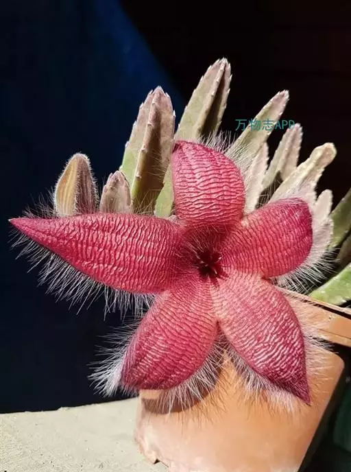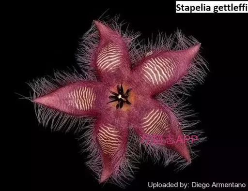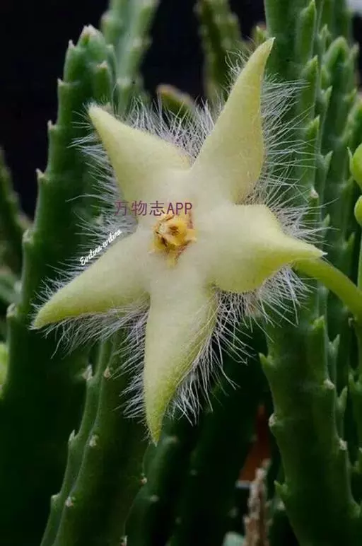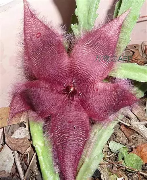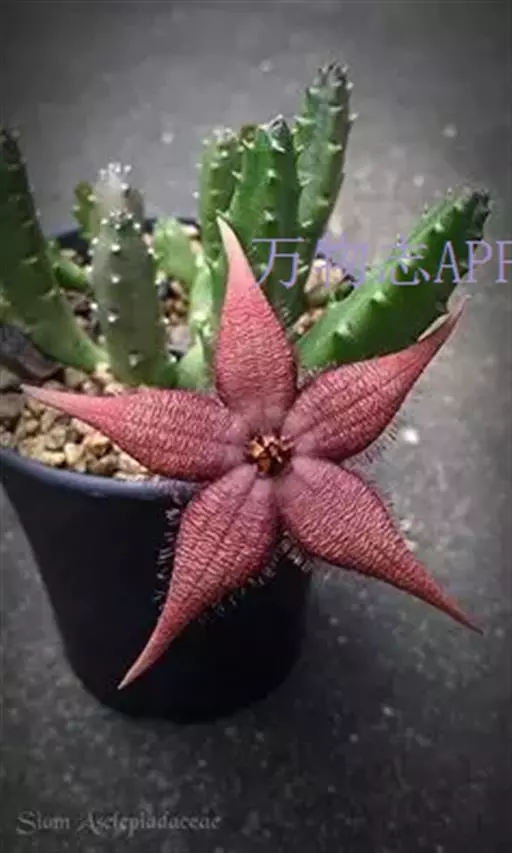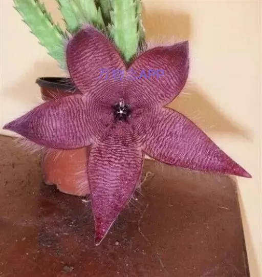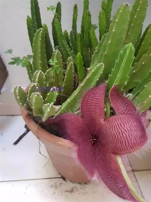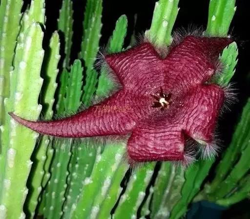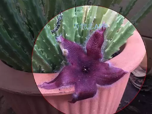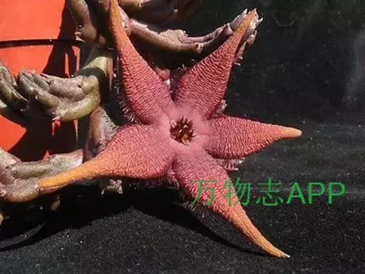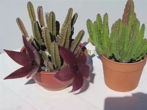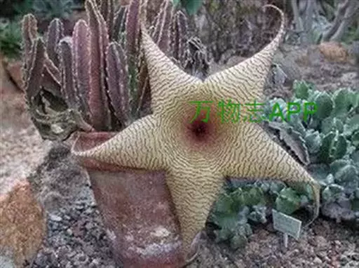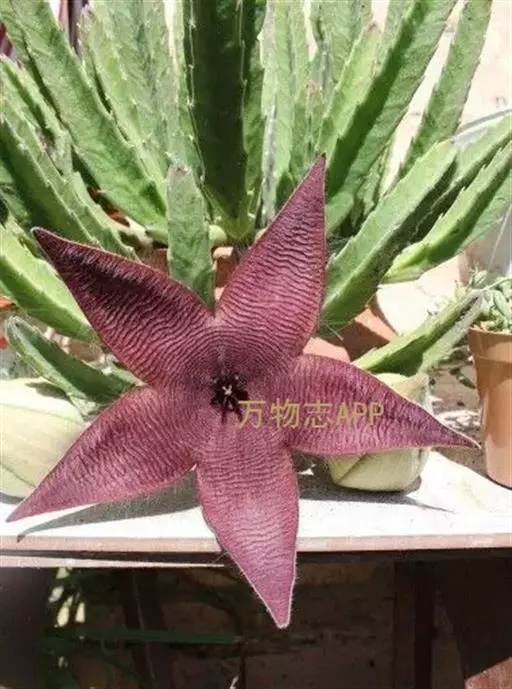 犀角(Stapelia luxurians Dammann ex Rust):其肉质茎青绿色,四棱柱形基部分枝群生,棱间下凹,具稀疏自钰聋状缘。花星形,直径10-12厘米紫红褐色,具淡黄色波状横纹,花瓣学被紫色毫毛。夏、秋季节开放。