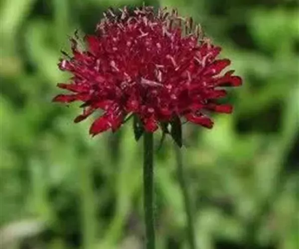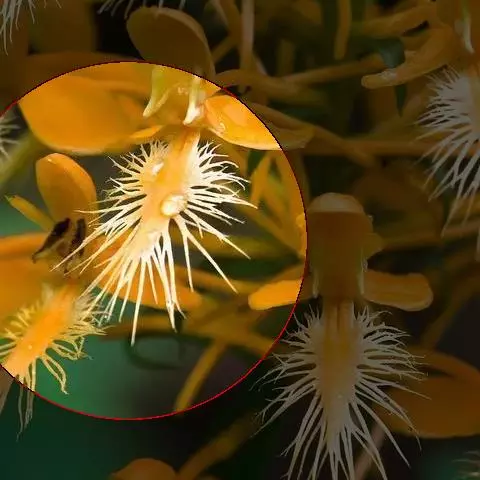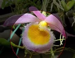 总状花序出自落了叶的老茎上,长5-25毫米,呈簇生状,密生6-10朵花;花苞片膜质,卵状披针形,长约3毫米,宽2.5毫米,先端急尖;花梗和子房褐绿色,长约1.3厘米;花鲜红色,不甚张开;中萼片椭圆形,长约1厘米,宽5毫米,先端钝,具5条脉;侧萼片斜卵形,与中萼片等大,先端锐尖,基部歪斜,具5条脉;萼囊狭圆锥形,长约1厘米。