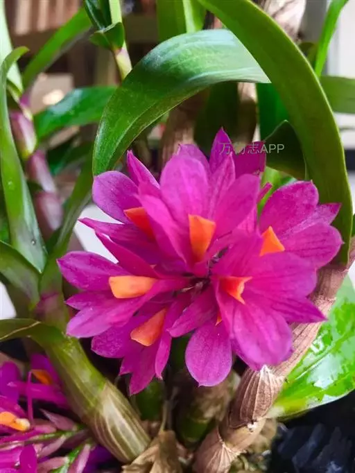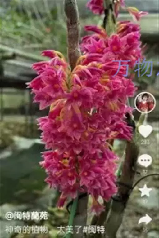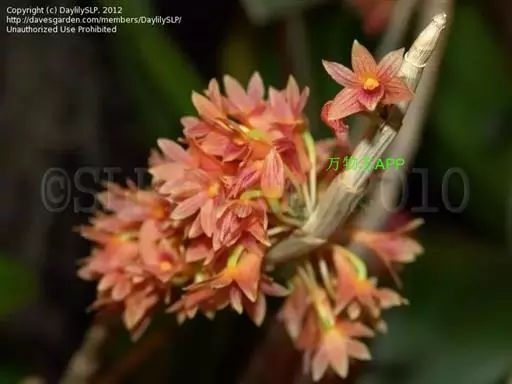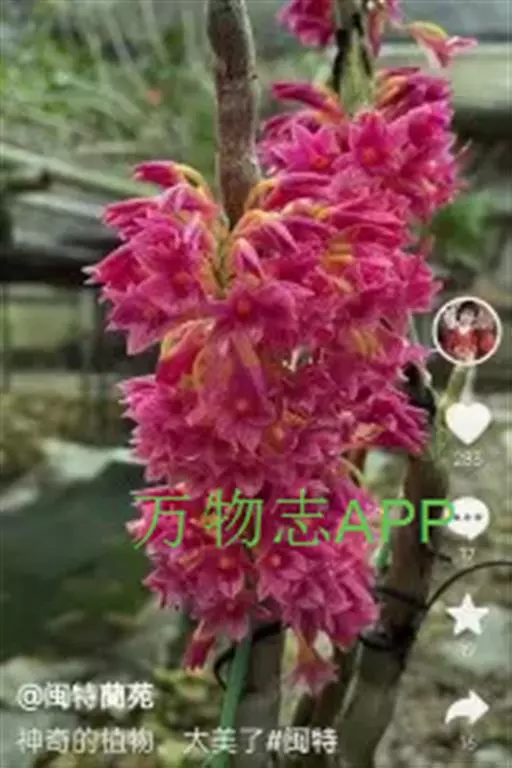 红花石斛(学名:Dendrobium miyakei Schltr.):茎直立或悬垂,圆柱形,有时中部增粗而稍呈纺锤形,基部收窄,不分枝,具多个节。叶薄革质,披针形或卵状披针形。总状花序出自落了叶的老茎上,呈簇生状,密生6-10朵花;花鲜红色,不甚张开;花瓣斜倒卵状长圆形,等长于中萼片而稍较狭,先端锐尖,基部收狭,具3条脉;唇瓣匙形,长1.5-2.2厘米,宽7-8.5毫米,先端稍钝,基部具狭的爪,全缘。花期3-11月常不定时开放。