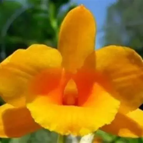 独角石斛,Dendrobium unicum,兰科石斛属植物。花瓣橙黄色,唇瓣反转似犀牛角,…