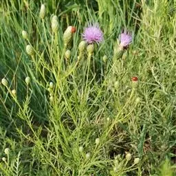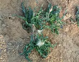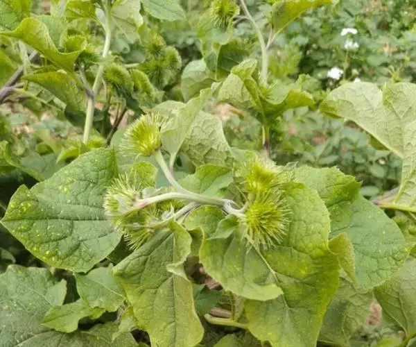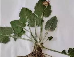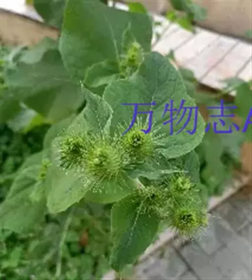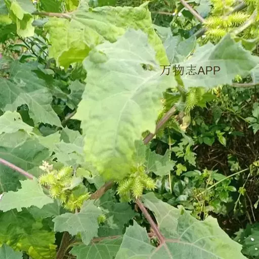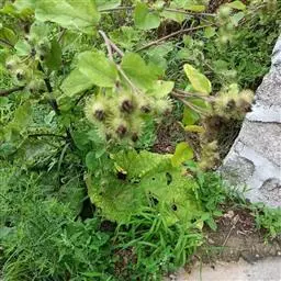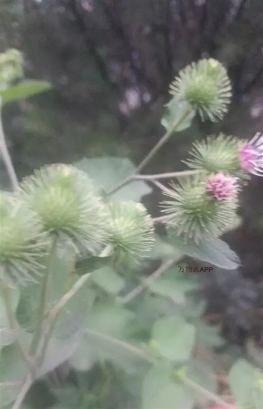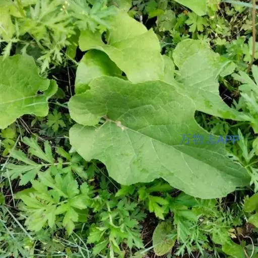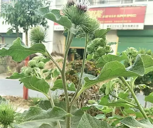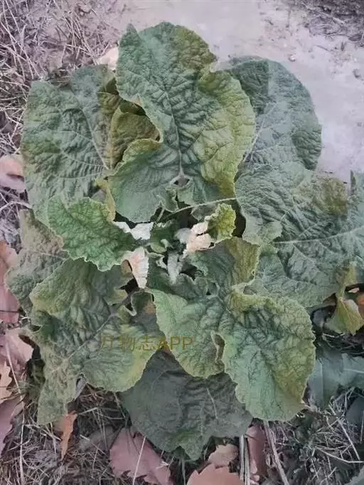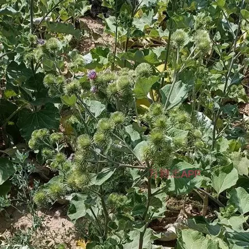 牛蒡 二年生草本,具粗大的肉质直根,长达15厘米,径可达2厘米,有分枝支根。茎直立,高达2米,粗壮,基部直径达2厘米,通常带紫红或淡紫红色,有多数高起的条棱,分枝斜升,多数,全部茎枝被稀疏的乳突状短毛及长蛛丝毛并混杂以棕黄色的小腺点。