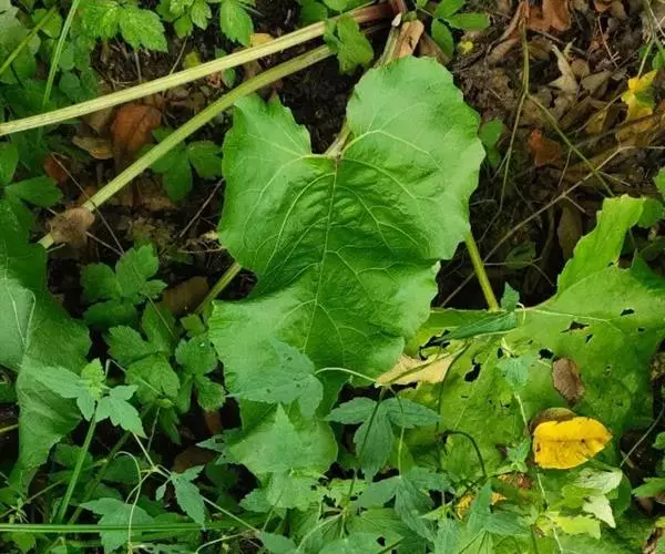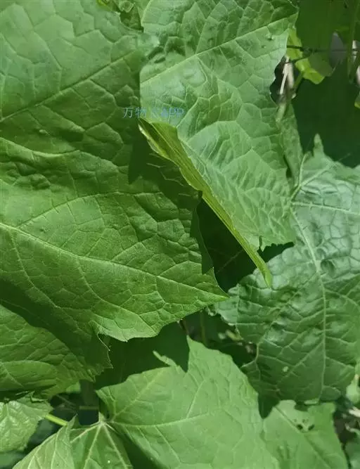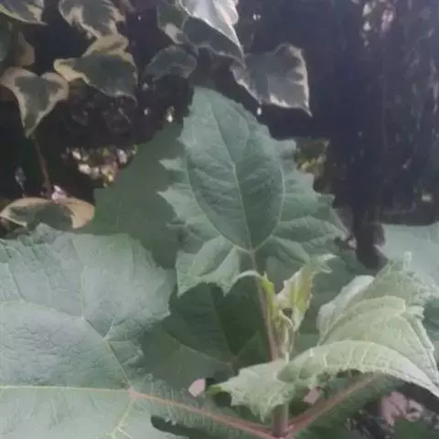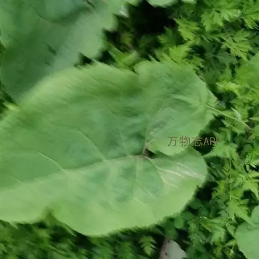 基生叶宽卵形,长达30厘米,宽达21厘米,边缘稀疏的浅波状凹齿或齿尖,基部心形,有长达32厘米的叶柄,两面异色,上面绿色,有稀疏的短糙毛及黄色小腺点,下面灰白色或淡绿色,被薄绒毛或绒毛稀疏,有黄色小腺点,叶柄灰白色,被稠密的蛛丝状绒毛及黄色小腺点,但中下部常脱毛。茎生叶与基生叶同形或近同形,具等样的及等量的毛被,接花序下部的叶小,基部平截或浅心形。