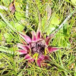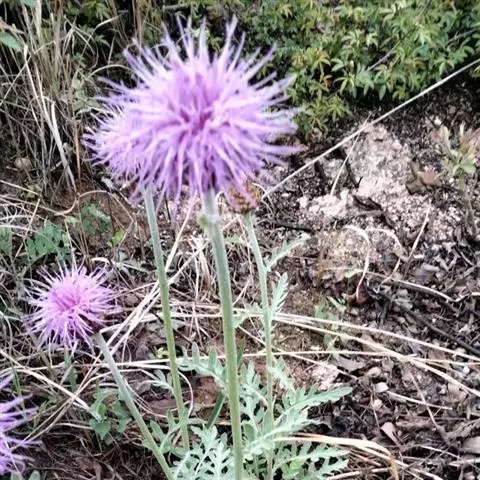 头状花序多数或少数在茎枝顶端排成疏松的伞房花序或圆锥状伞房花序,花序梗粗壮。总苞卵形或卵球形,直径1.5-2厘米。总苞片多层,多数,外层三角状或披针状钻形,宽约1毫米,中内层披针状或线状钻形,宽1.5-3毫米;全部苞近等长,长约1.5厘米,顶端有软骨质钩刺。小花紫红色,花冠长1.4厘米,细管部长8毫米,檐部长6毫米,外面无腺点,花冠裂片长约2毫米。