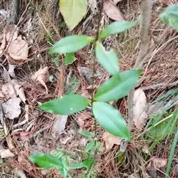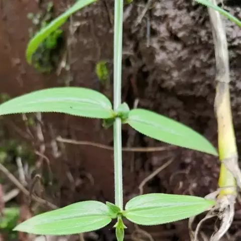 叶对生,仅在分枝处为近对生,叶片椭圆状披针形至卵圆状长圆形,长1-5厘米,宽0.5-1.5厘米(最大的达8×2.2厘米),顶端急尖至钝,具短尖头,基部急尖至钝,叶缘具细牙齿,两面无毛;叶脉纤细,在叶背微凸或扁平,在叶面不明显,侧脉每边10-15条,在叶缘前网结;叶柄长3-6毫米;叶柄间具腺体,老时脱落。