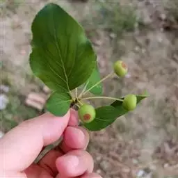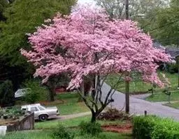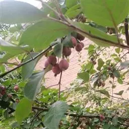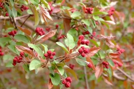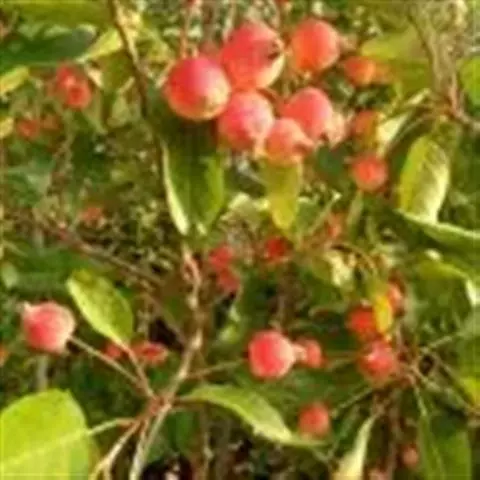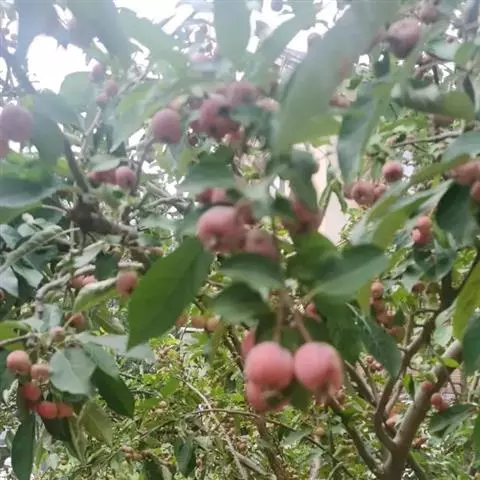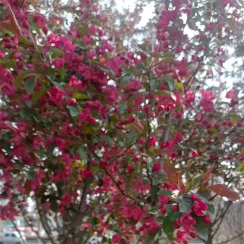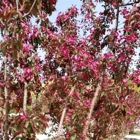 落叶小乔木,树势强,树姿直立,株高4.5-6米,冠幅6米,树形圆而紧凑,树干棕红色,皮孔大而多。树皮纵裂,多刺状短枝,枝条斜出,小枝紫红色,老枝红褐色。嫩叶紫红色,逐渐变为翠绿色;叶卵圆形至椭圆形,先端短尖,基部圆形或宽楔形,边缘具钝锯齿。单瓣花,直径4-4.5厘米,总状伞形花序,花期4月中下旬,花蕾深紫红,花深粉红色,杯状,5-6朵簇生于枝顶,花开繁密而艳丽,花径约1.2厘米,花梗紫红色,密被柔毛,半直立。果期6-10月,果锥形,橘黄或枯红色,结果量大,果顶尖,萼片宿存直立,挂果期可长达数月,直到隆冬。