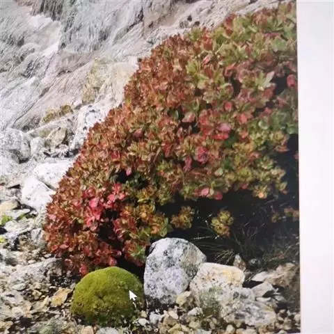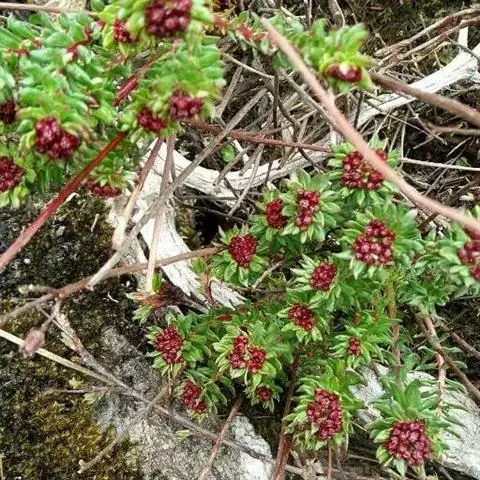 高山红景天〔学名:Rhodiola cretinii (Hamet)H. Ohba subsp. sino-alpina (Frod.))H. Ohba〕景天科:红景天属多年生草本植物,高达5厘米。根颈细,叶互生,花茎全部疏生,花序顶生,雌株有花,聚伞状着生。花常为四基数;雌花淡绿色或白色,8月初开花。7-8月结果,