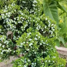 龙柏是圆柏的人工栽培变种。树冠圆柱状或柱状塔形;枝条向上直展,常有扭转上升之势,小枝密、在枝端成几相等长之密簇;鳞叶排列紧密,幼嫩时淡黄绿色,后呈翠绿色;球果蓝色,微被白粉。