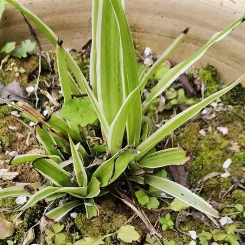 金心吊兰地下部有根茎,叶细长,线状披针形,中心具黄白色纵条纹,基部抱茎,鲜绿色。叶腋抽生匍匐枝,伸出株丛,弯曲向外,顶端着生带气生根的小植株。花白色,花被6片,花期春夏季。