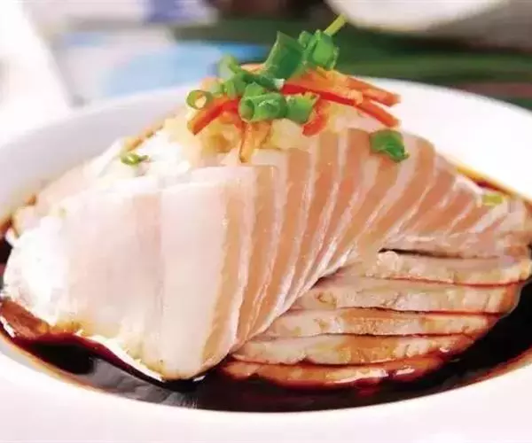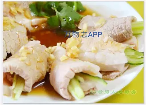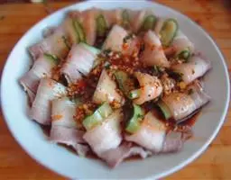 选用肥瘦相连的坐臀肉或五花肉传统上选用前者,经水煮刚断生、切片、卷片和凉拌而成,成菜香辣鲜美,蒜味浓厚,爽脆嫩滑。五花肉一向是中式菜的主角,将它放入清水中连皮烹煮,可使汤汁浓稠油亮,五花肉肥美多汁,用青瓜条将肉片卷成团,蘸着蒜泥酱汁送入口,就算多吃都不怕腻。