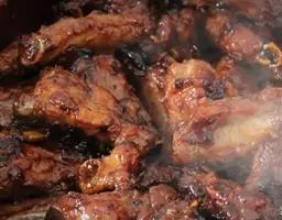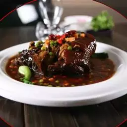 原料:猪臀肉500克。 大蒜50克、上等酱油50克、红油10克、盐2克、冷汤50克、红糖10克、香料3克、味精1克。